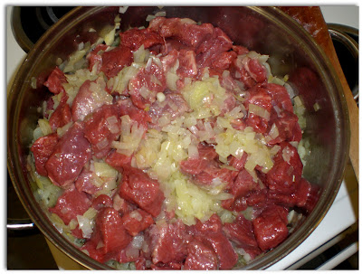 - Una vez que la cebolla está cocida (dorada), agregar la carne. Bajar la temperatura al número 3. Mezclar la cebolla con la carne. Cubrir la cacerola y revolver otra vez después de un minuto o dos (máximo dos). Revolver frecuentemente para evitar que la cebolla se queme. Un goulash quemado no es goulash.